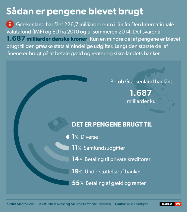 Resten af pengene er blevet brugt på at betale af på gæld og renter, holde bankerne flydende og betale private kreditorer kontante beløb for den gældsnedskrivning, man foretog i 2012, viser opgørelsen fra MacroPolis.